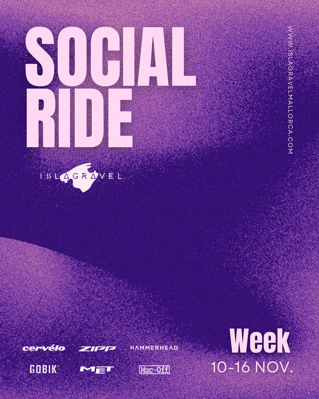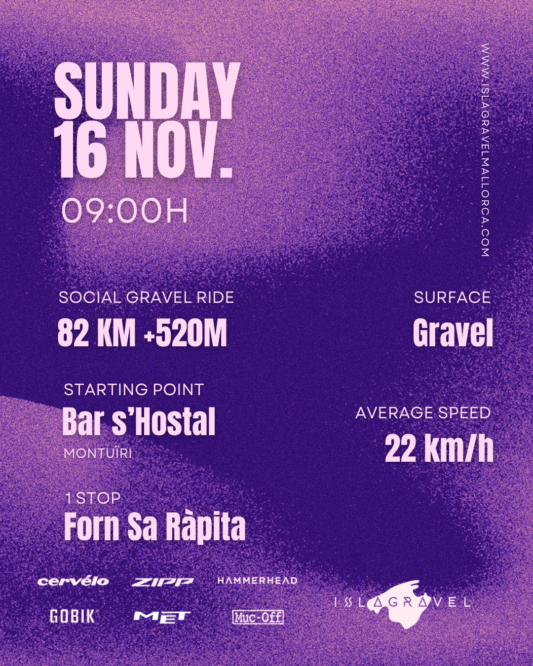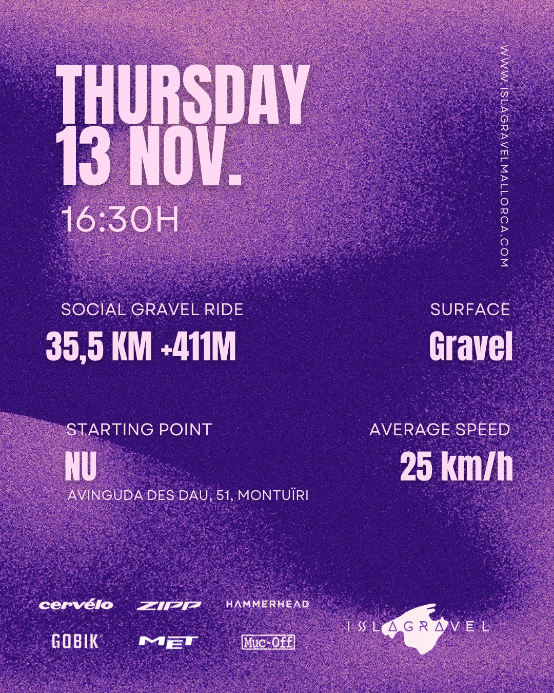 ESP. Esta semana vuelve la ISLAGRAVEL Social Ride Week Rutas para disfrutar del gravel, el paisaje y la mejor compañía. Vive la experiencia completa alquilando una Cervélo Áspero directamente desde nuestra web 🌐 📅 Jueves 13 de noviembre · 16:30h Nueva salida Social Gravel Ride ISLAGRAVEL Una ruta de 35,5 km +411 m para disfrutar del mejor ambiente gravel con salida desde NU, Montuïri. Terreno mixto, ritmo medio de 25 km/h y buenas vibras aseguradas. 📅 Domingo 16 de noviembre · 09:00h Cerramos la ISLAGRAVEL Social Ride Week con una ruta de 82 km +520 m y una parada en el clásico Forn Sa Ràpita 🍞☕ Salida desde Bar s’Hostal (Montuïri) y ritmo medio de 22 km/h para disfrutar del mejor ambiente gravel 💜 ⸻ ENG. This week the ISLAGRAVEL Social Ride Week is back Gravel routes to enjoy the ride, the landscape, and great company. Live the full experience by renting a Cervélo Áspero directly on our website 🌐 📅 Thursday, November 13 · 4:30 PM New ISLAGRAVEL Social Gravel Ride A 35.5 km +411 m route to enjoy the best gravel mood starting from NU, Montuïri. Mixed terrain, average speed 25 km/h, and all the good vibes. 📅 Sunday, November 16 · 9:00 AM We close the ISLAGRAVEL Social Ride Week with an 82 km +520 m route including a stop at the iconic Forn Sa Ràpita 🍞☕ Starting from Bar s’Hostal (Montuïri) at an average pace of 22 km/h — pure gravel vibes 💜